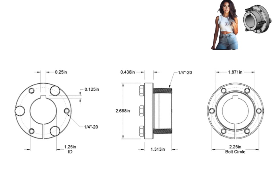 SH Series 1-1/4" Finished Bore QD Bushing for SH series Sprockets & Sheaves. QD Bushing, Black Oxide over C45 Steel Finish. Standard Keyway. 3-(1/4-20 X1-3/8) Screws. Torque Capacity 3500 lbs./in.